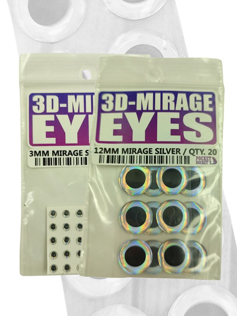 Los 3D Mirage Eyes aportan una terminación altamente realista a todo tipo de imitaciones de alevinos y peces forrajeros. Sus colores Mirage generan reflejos sutiles y naturales que cambian según la incidencia de la luz, logrando un efecto visual muy atractivo bajo el agua.