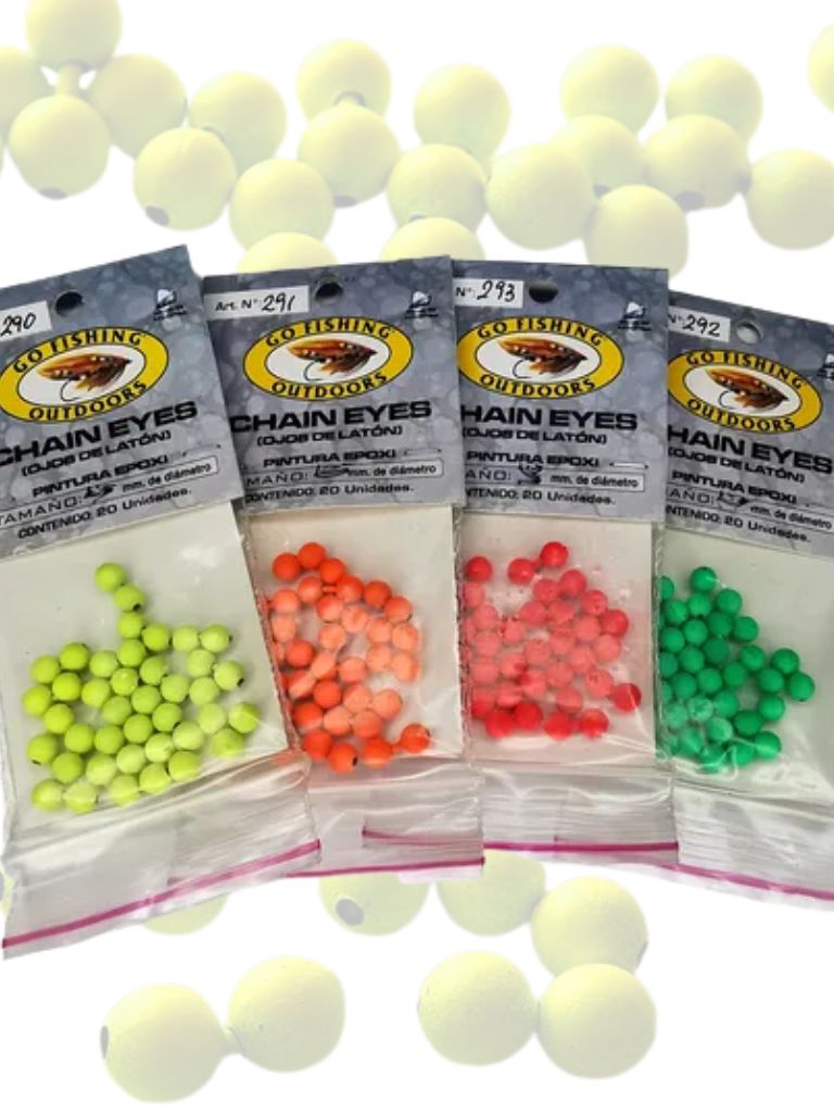 Los Bead Chain Pintados GO FISHING son ojos de cadena ideales para aportar peso moderado, silueta y un marcado efecto vibratorio en todo tipo de moscas. Funcionan especialmente bien en aguas turbias o turbulentas, donde su movimiento y corte de agua generan un estímulo irresistible para los peces.