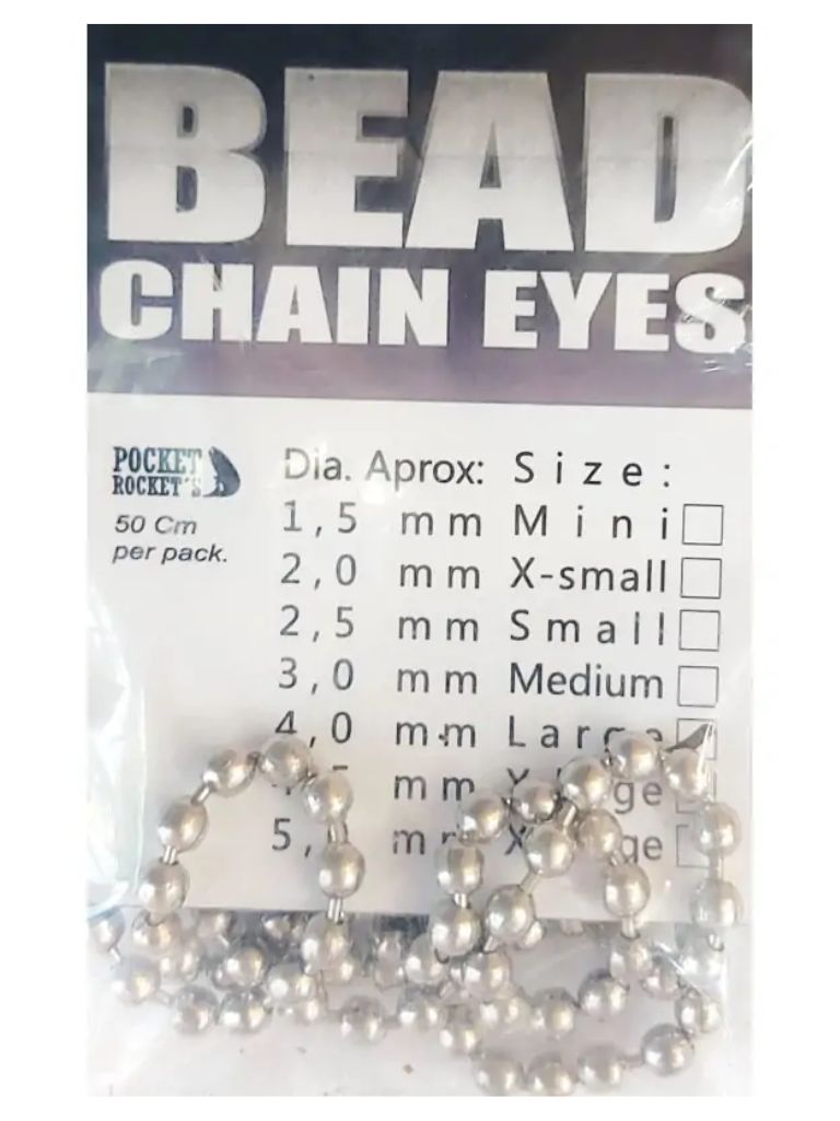 Los Bead Chain Eyes de Pocket Rocket's son un componente clásico y extremadamente versátil en el atado de moscas. Sus ojos esféricos de cadena son muy fáciles de utilizar y se emplean en una enorme variedad de patrones para agregar peso, silueta y un sutil efecto vibratorio y sonoro que resulta altamente atractivo para los peces.