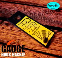 Este práctico calibre se adapta a la mayoría de los mástiles. Para determinar el tamaño del hackle, simplemente doblá la pluma alrededor del pasador ubicado en la parte inferior del medidor: el hackle se abrirá y las puntas indicarán, sobre el gráfico curvo, el tamaño correcto.