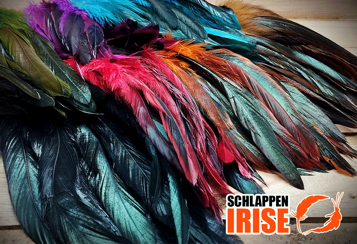 Plumas de cola de gallo Shlappen Irise seleccionadas, especialmente diseñadas para el atado de streamers gigantes orientados a la pesca de grandes depredadores. Se destacan por ser muy suaves, largas y anchas, con un atractivo efecto tornasolado (Irise) que aporta volumen, movimiento y máxima visibilidad bajo el agua.