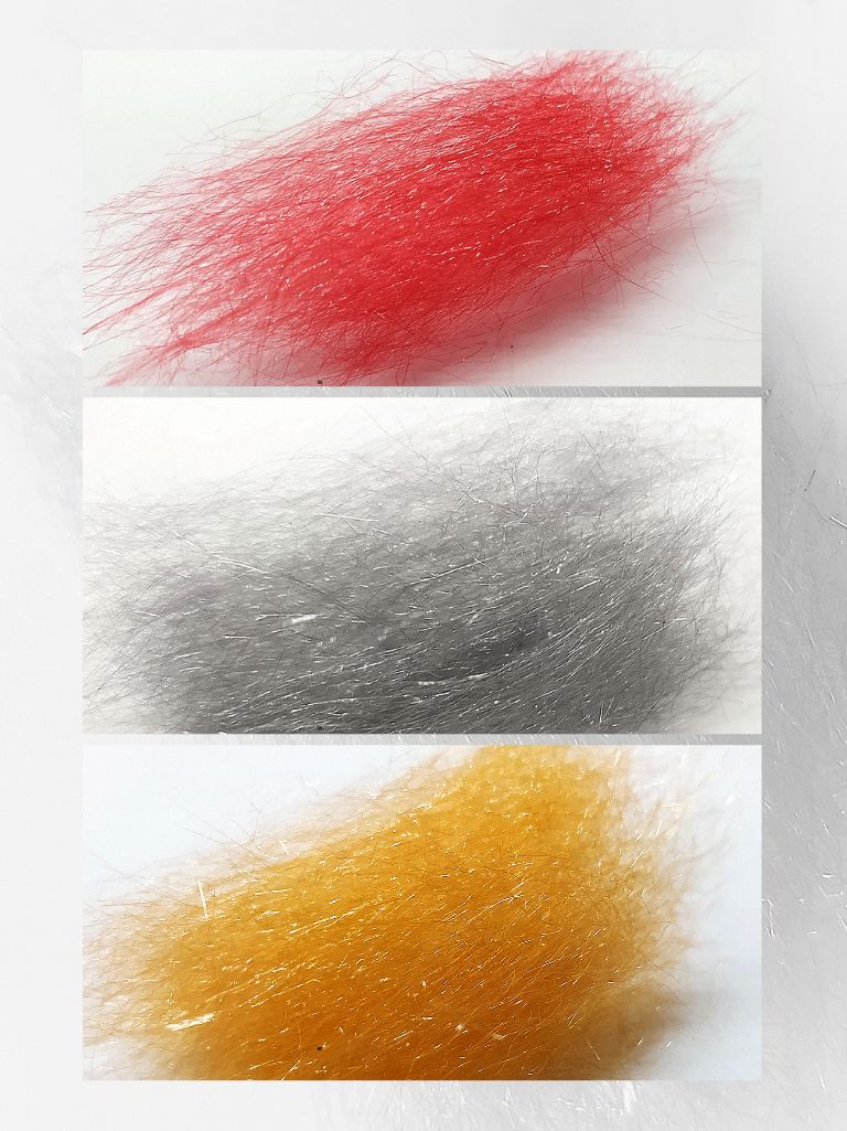 Fibras sintéticas de nylon plano micro delgado, de aspecto brillante, perlado, natural y teñido, diseñadas para ofrecer un movimiento único dentro y fuera del agua. Cada fibra mide aproximadamente 5 cm, se humecta rápidamente y posee una textura muy suave, lo que lo convierte en un material extremadamente fácil de trabajar en todo tipo de patrones.